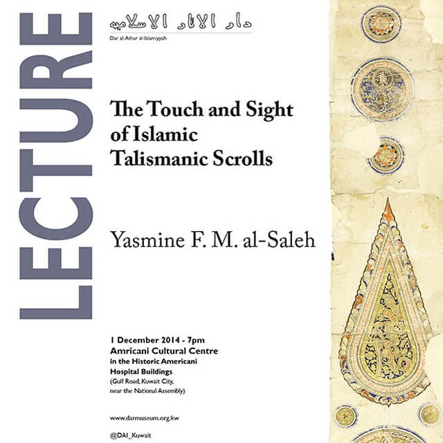 During her lecture at the Amricani Cultural Centre, Dr. Yasmine F. M. al-Saleh, author of “In Color, The Art of the Talismanic: A Study of LNS 12 MS and LNS 25 MS from The al-Sabah Collection”, talks about two large, beautiful, and colorful talismanic scrolls that are part of the al-Sabah Collection. These two undated, unpublished Mamluk scrolls display clearly defined and self-contained chapters related to diverse topics, such as the names of God, dispersing magic and protection charms, and reports on various equestrian and military activities.