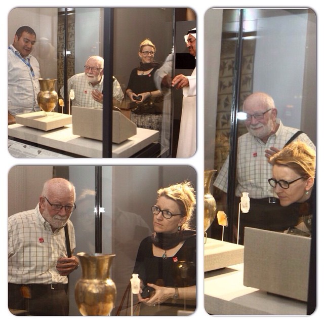 Former Deputy Prime Minister and Minster of Commerce and Industry Abdul-Mohsen al-Madaj and Professor of Welsch History and Archaeogly at Bangor University Professor G. Rex Smoth visiting the Splendors of Ancient East exhibition at Dar al-Athar al-Islamiyyah’s Amricani Cultural Centre. They were taken on a guided tour by DAI’s Ali Akashah.