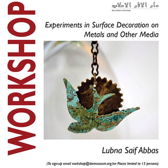 Glass Jewlery Workshop instructor Lubna Saif Abbas gave Friends of Dar al-Athar al-Islamiyyah an overview using objects from the DAI Collection as a starting point. These objects use a combination of techniques from embossing, silkscreen, stamping and patina applications to show the versatility of jewelry decorations.