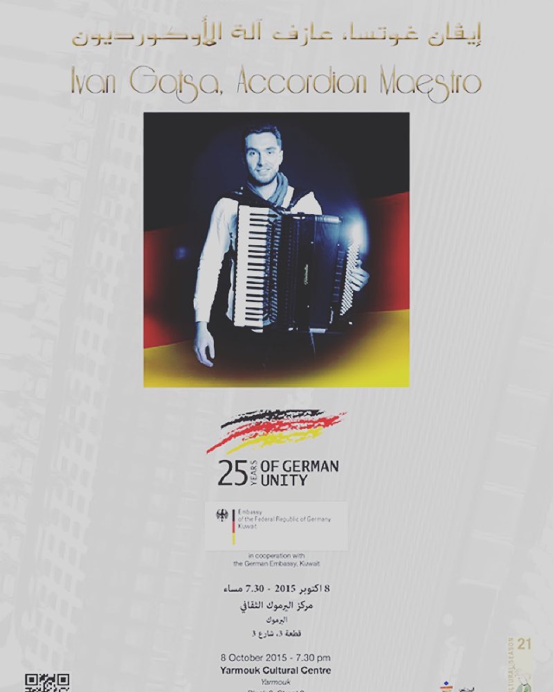 Virtuoso accordionist Ivan Gotsa performing light classical pieces from Scarlatti to his own contemporary arrangements at the al-Yarmouk Cultural Centre.