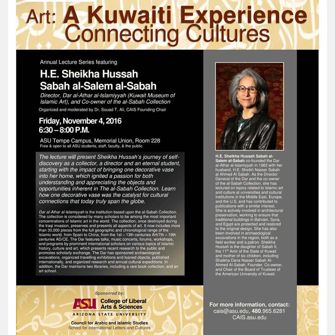 Sheikha Hussah Sabah al-Salem al-Sabah, Director-General of Dar al-Athar al-Islamiyyah, will start this week a trip to USA. She will be giving a talk on ( Art: Kuwaiti Experience in connecting Cultures ) at Arizona State University organised by the Council for Arabic and Islamic Studies. NYC is Sheikha Hussah’s next stop to attend the quarterly meeting of The Met Board of Trustees, where she’s been a member since 2010.