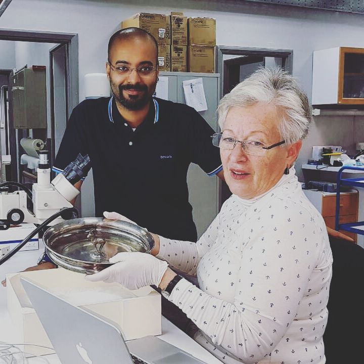 Dr. Trudy Kawami, the renowned scholar of ancient Near Eastern art, examines a 3rd millennium silver plate to include in her forthcoming publication on The al- Sabah Collection. Mutaq al- Juraid, assistant- curator at The al-Sabah Collection is seen next to her.