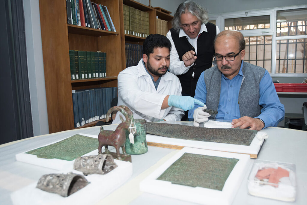 Rajesh Poojari, metalwork conservator, showing the restoration he effected on a South Arabian plaque from The al-Sabah Collection to Dr Sabyasachi Mukherjee, director of the CSMVS museum, Mumbai and Dr Anupam Sah, director of the Art Conservation Centre.