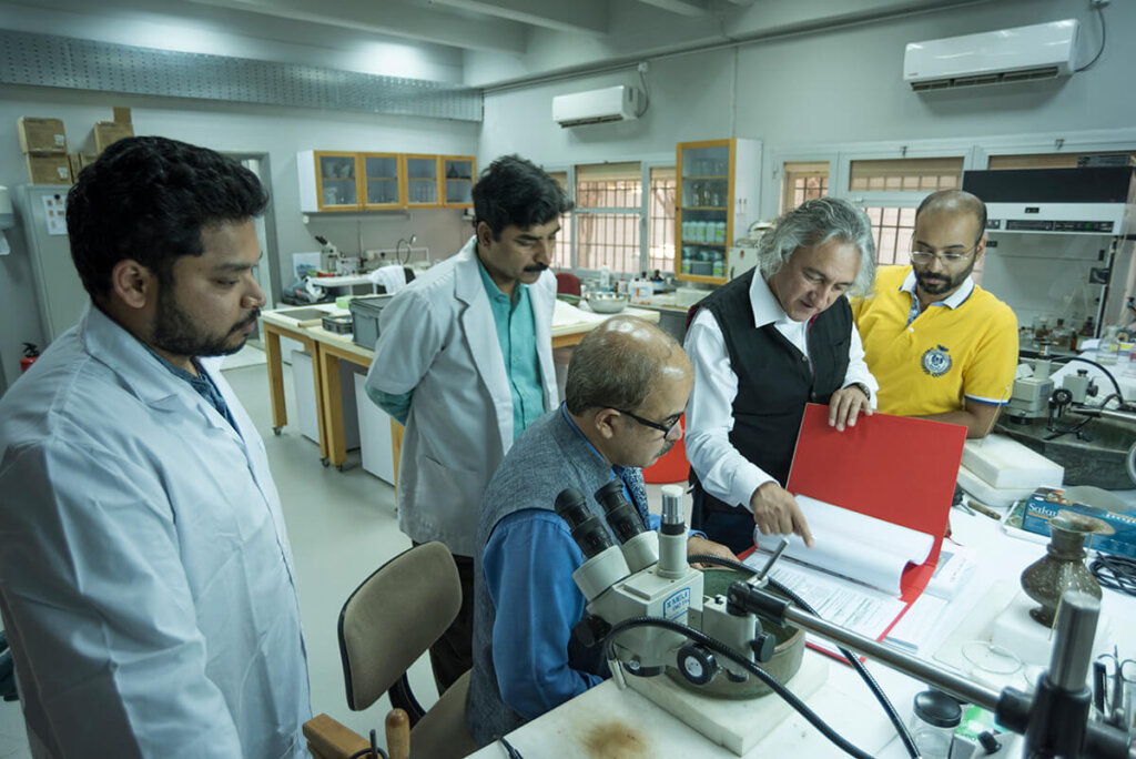 Dr Sabyasachi Mukherjee, director of the CSMVS museum, Mumbai and Dr Anupam Sah, director of the Art Conservation Centre, Mumbai reviewing the work reports of the Art Conservation Centre’s conservators who are working on the The al-Sabah Collection objects.