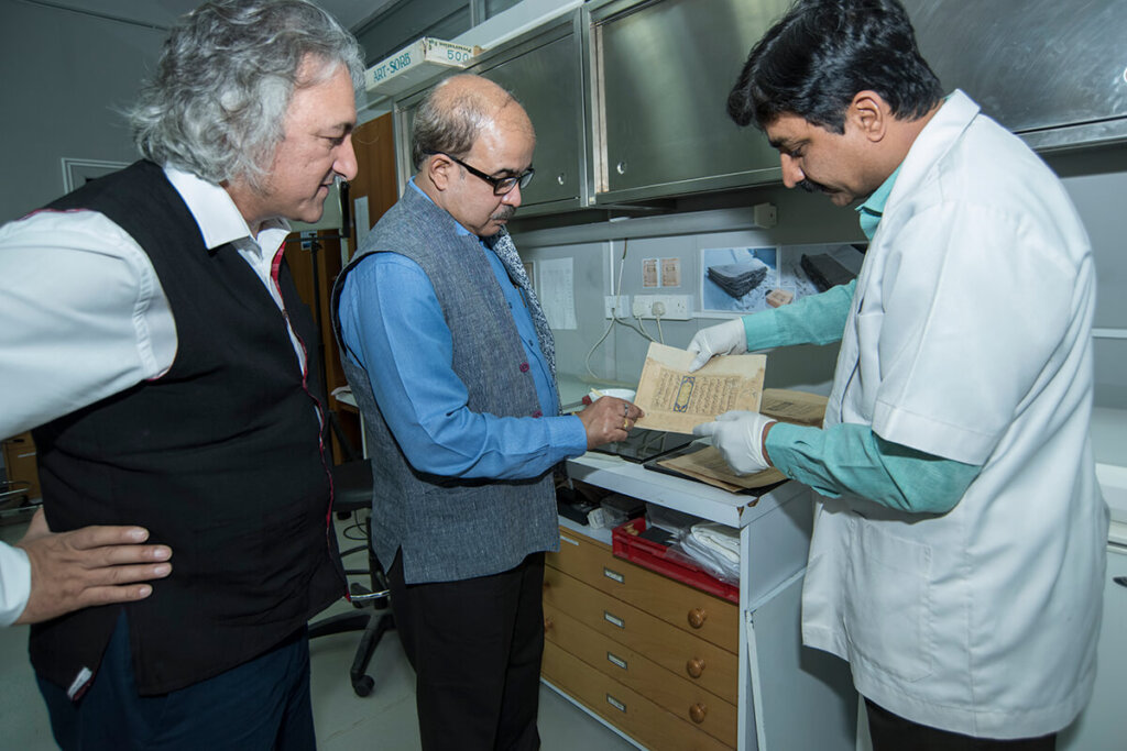 Lalit Pathak, paper conservator, showing the restoration he effected on a manuscript from The al-Sabah Collection to Dr Sabyasachi Mukherjee, director of the CSMVS museum, Mumbai and Dr Anupam Sah, director of the Art Conservation Centre.