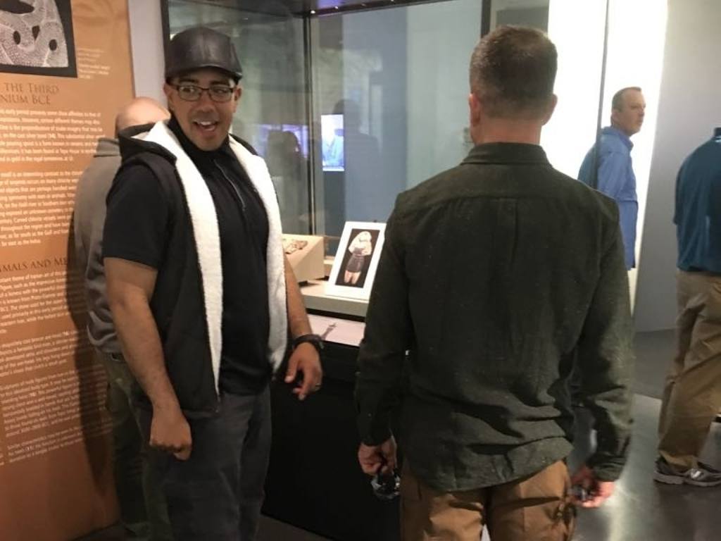 Soldiers from Camp Arifjan visited the Amricani Cultural Centre yesterday evening. DAI docent Fatema Hussain gave them a tour of the exhibitions after they checked out Story of Amricani.