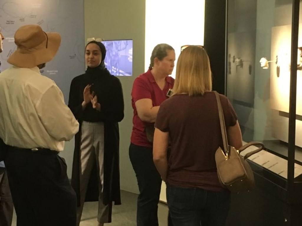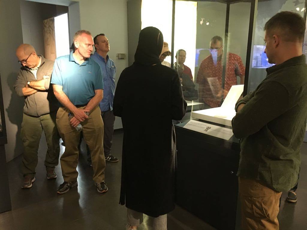 Soldiers from Camp Arifjan visited the Amricani Cultural Centre yesterday evening. DAI docent Fatema Hussain gave them a tour of the exhibitions after they checked out Story of Amricani.
