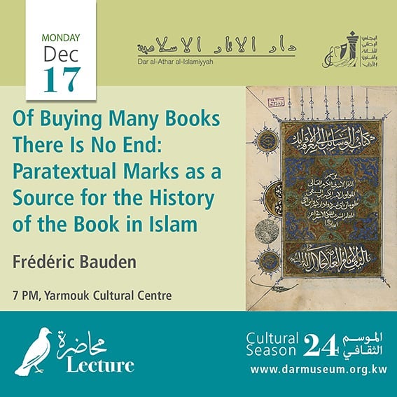 During the Mamluk period, Cairo was renowned for its book markets and the richness of its public and private libraries. Over the last century, there has been renewed interest in the history of the book, collecting and libraries. Published studies focused on data provided by primary sources, but largely overlook information supplied by the books themselves. Paratextual marks, the focus of this lecture, are now the subject of greater scrutiny, as they constitute original pieces of valuable information on the history of the books. More than ever, these marks also give us the opportunity to analyze the itineraries of these objects