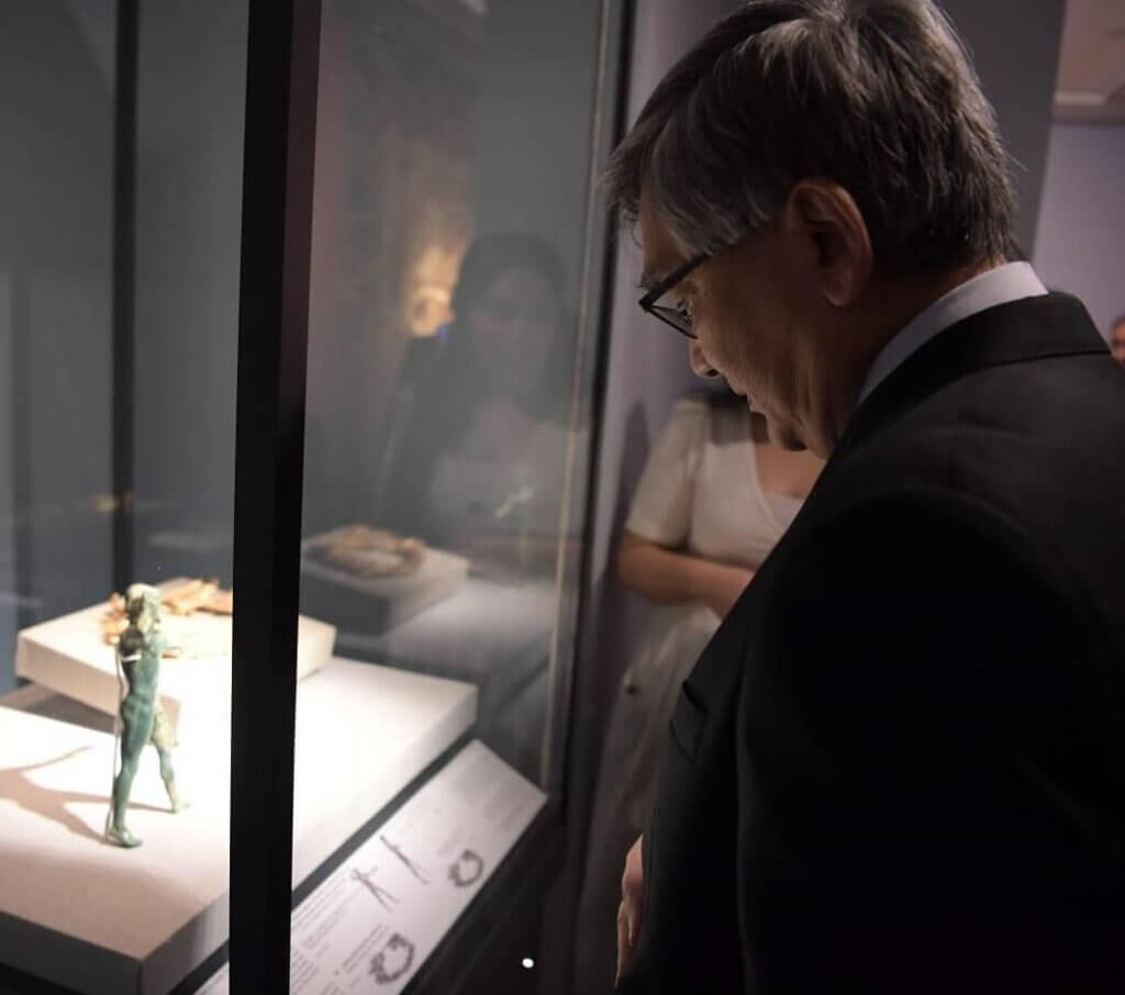 He showed his interest in the collection and objects on display.