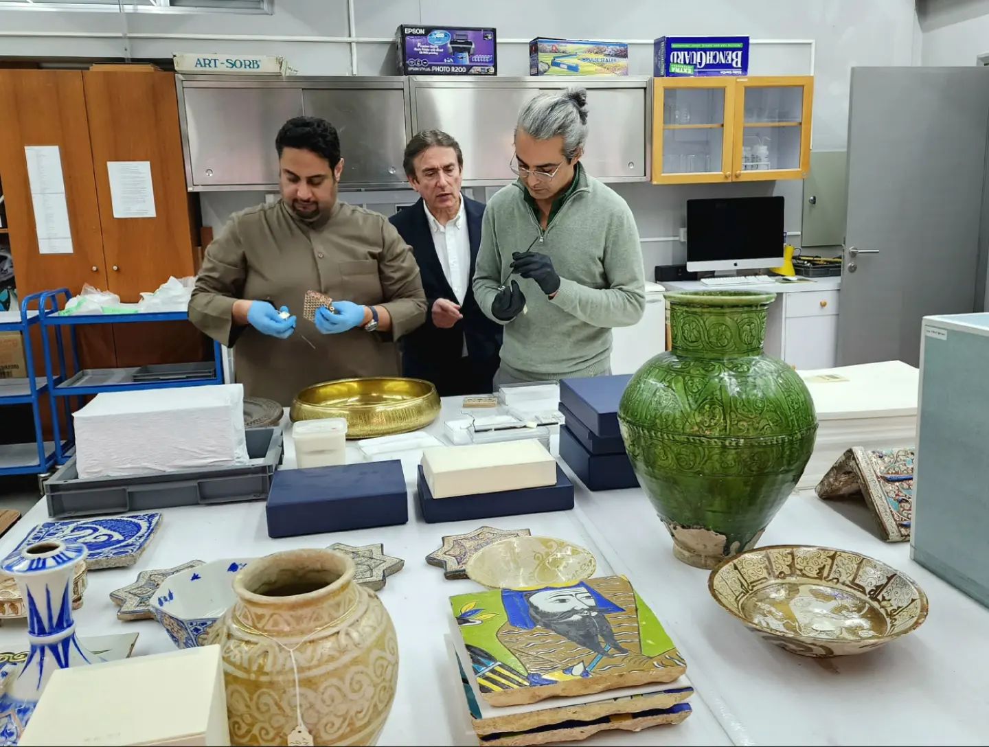 A group of mount- making specialists, headed by Mr. Colin Morris, are visiting Dar al-Athar to inspect the objects in al-Fann exhibition at Amricani Cultural Centre. These objects will be loaned to “The First House,” an exhibition on the history of the Holy Kabbah, organised by the Biennale of Dar’ia, to be held in Jeddah in late January 2023.
