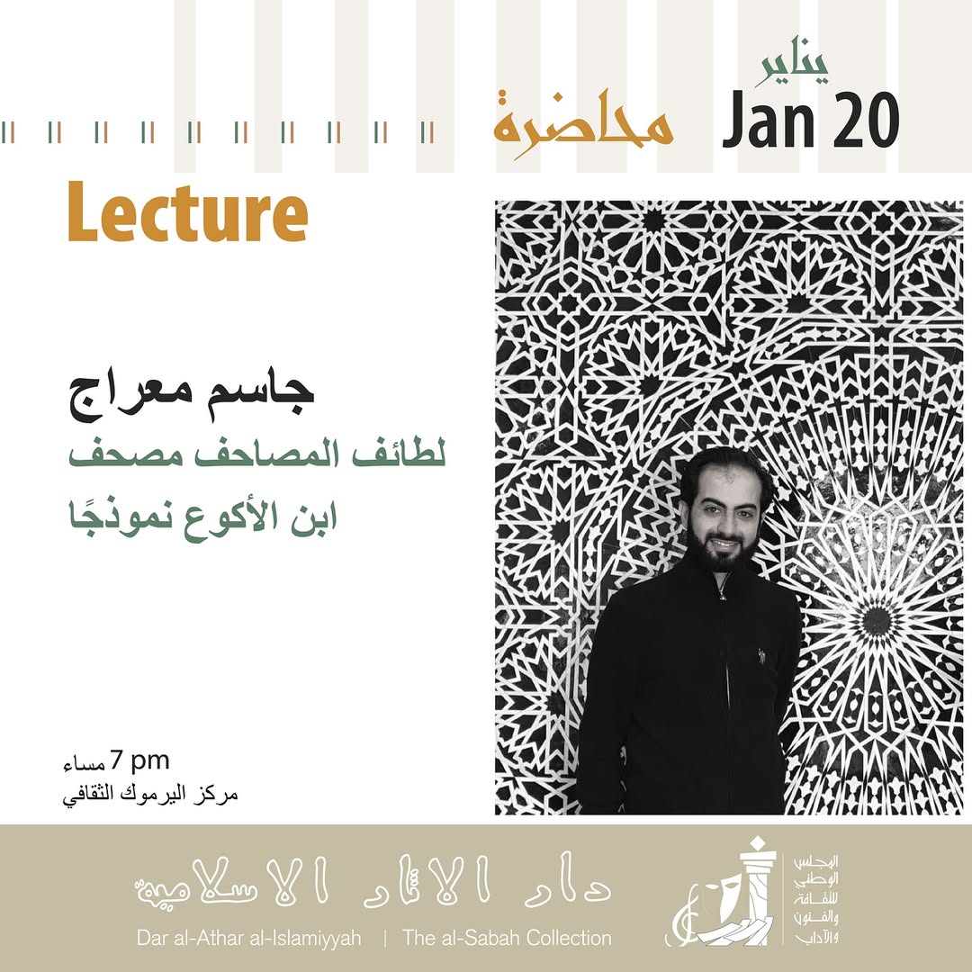 إنَّ أكبر نقطة تحول في تاريخ فن الخط العربي هي نزول الوحي الكريم على سيدنا محمد صلى الله عليه وسلم، إذ إِسْتَوْجَبَ على المؤمنين أنْ يَتلقوا هذا الكلام بتقديرٍ وتوقيرٍ تعظيمًا لشعائره، وتسليمًا لإعجازه وإيقانًا بـأنَّه كتاب “لَا يَـأْتِيهِ الْبَاطِلُ مِنْ بَيْنِ يَدَيْهِ وَلَا مِنْ خَلْفِهِ تَنْزِيلٌ مِنْ حَكِيمٍ حَمِيد ٍ” في هذه المحاضرة سيتم التطرق إلى جمَاليَّات المصاحف وما تُخفيه من لطائفٍ وحكايات وبالأخص المصحف الذي خَطَّهُ عبدالله بن الأكوع من ضِمنِ مقتنيات دار الآثار الإسلامية، كُتِبَ هذا المصحف بخط نسخ اعتيادي، لكن ما مَيَّزَهُ عن باقي المصاحف تفاعل الخَطَّاط ابن الأكوع مع الآيات والتعبير عنها بطرقٍ متنوعة