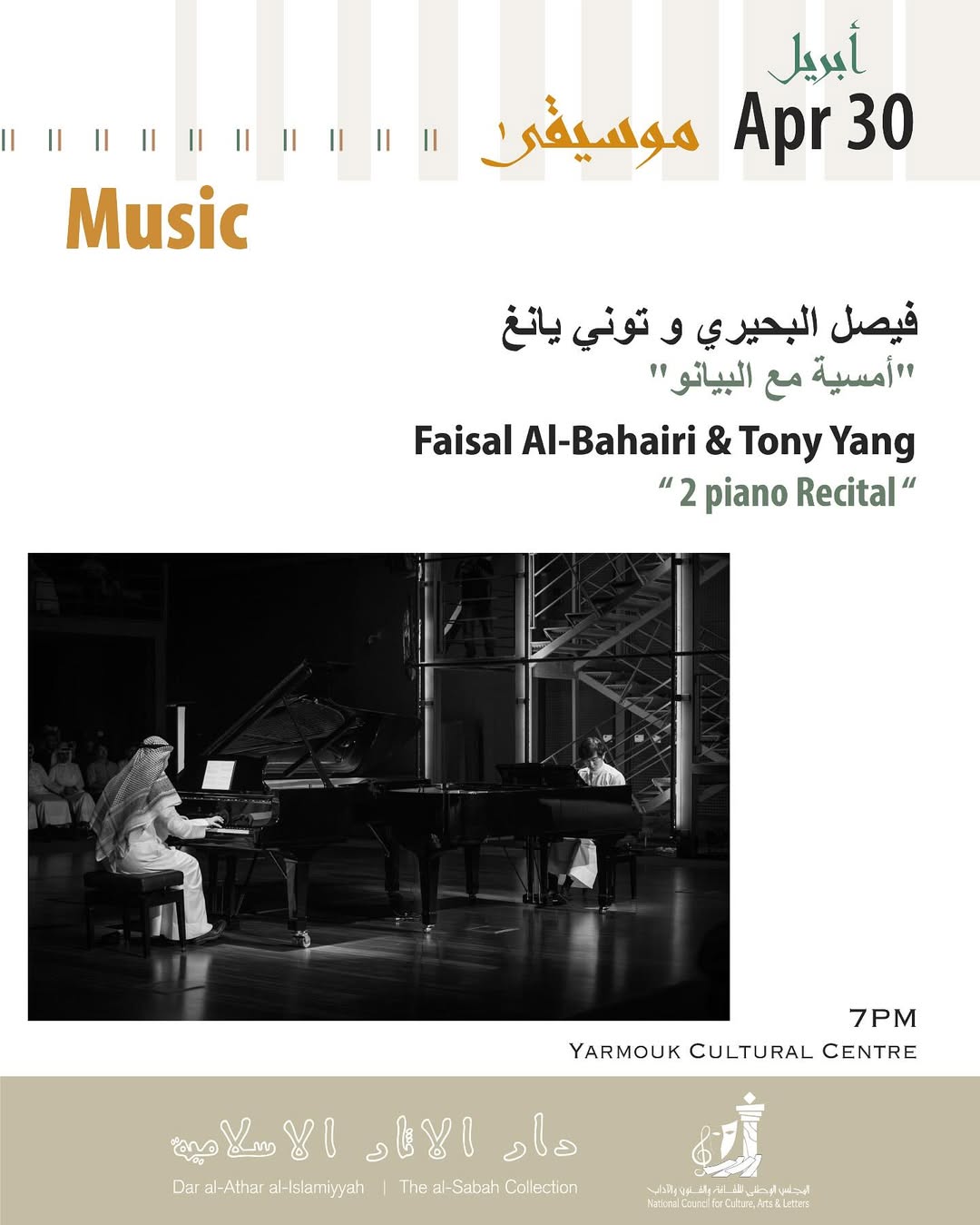 Tonight’s exceptional evening of piano music featuring celebrated pianists Faisal Albahairi (Kuwait) and Tony Yang (Canada) at the Yarmouk Cultural Centre.