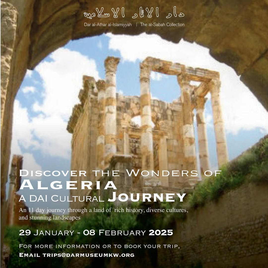 A group of Dar al-Athar al-Islamiyyah’s Friends embarked on an exploratory journey through Algeria’s cultural treasures! The trip included visits to the Tipaza Museum, which showcases the region’s rich history, and the Royal Mausoleum of Mauretania, a UNESCO World Heritage site. They explored the Byzantine-style Notre Dame d’Afrique Cathedral and the lush Garden of El Hamma, home to centuries-old trees and rare plant species. In Constantine, they admired the striking Monument to the Dead and visited the Emir Abdelkader Mosque, a masterpiece of Islamic architecture. In Ghardaïa, they were captivated by the historic market and its unique handmade carpets before concluding their journey in Timgad, the legendary Roman city that remarkably retains its original layout. A journey filled with history, art, and culture.